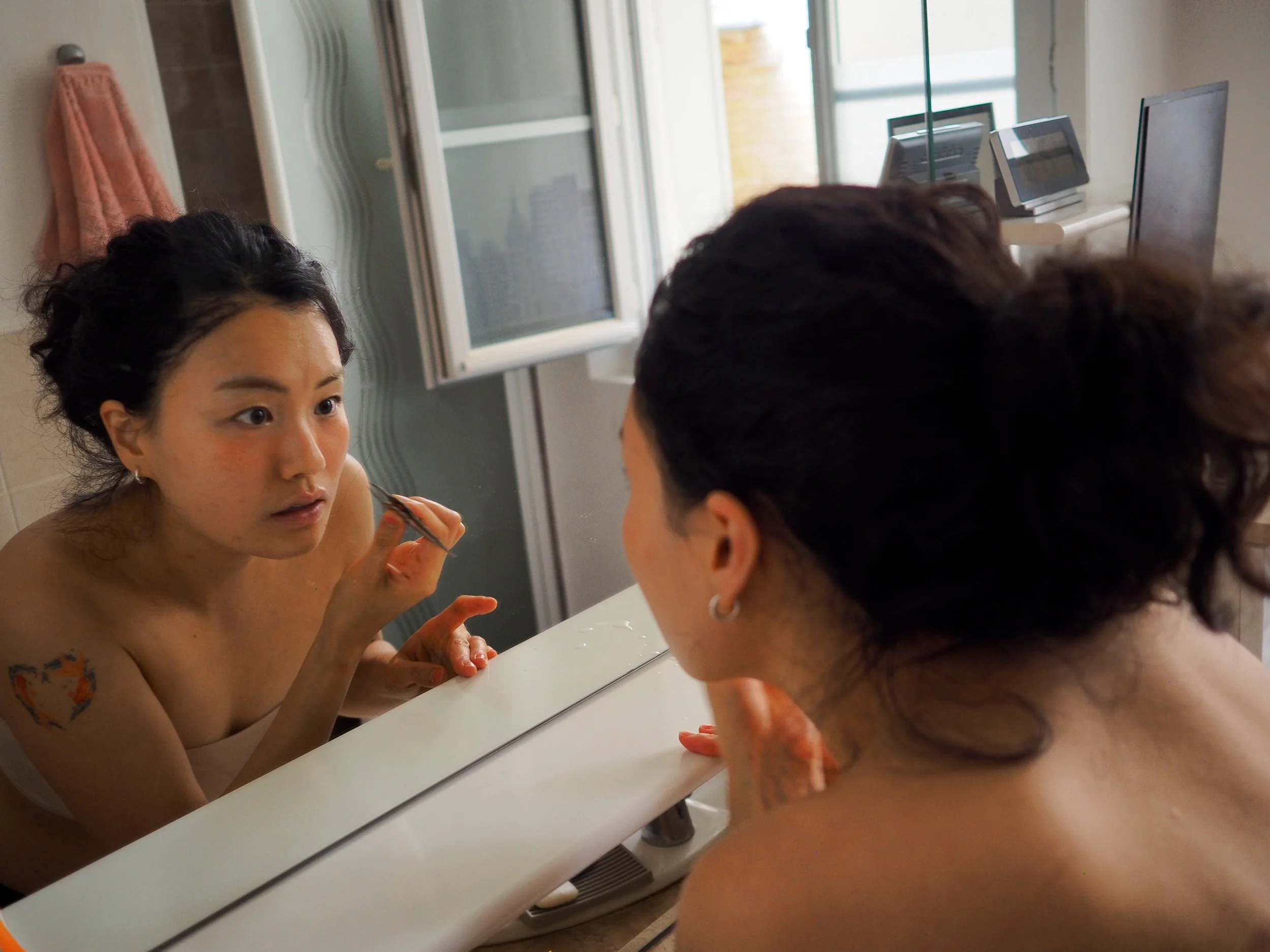 While I’m working on my camera settings, Younju starts absent-mindedly examining her body hair.